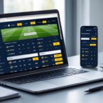 Seorang pengguna sedang melihat layar perangkat dengan tampilan taruhan bola online, dikelilingi oleh kopi dan ponsel di meja kerja.
