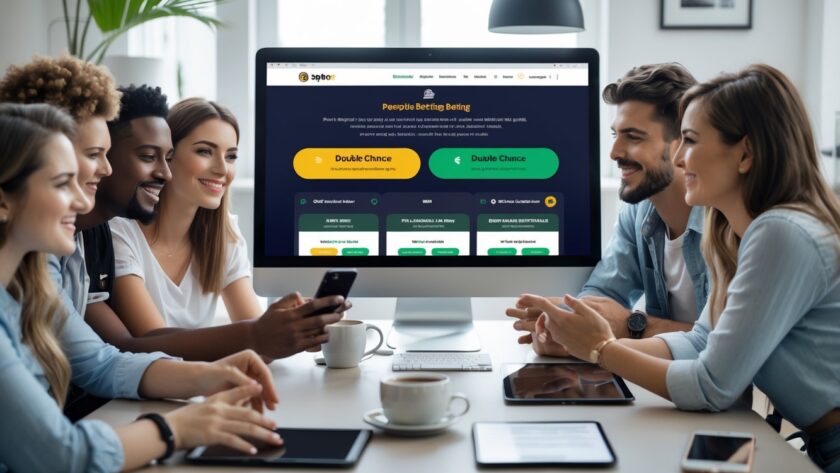 Seorang pengguna di depan laptop dengan tampilan situs taruhan bola online yang menampilkan pilihan taruhan double chance, dikelilingi oleh smartphone dan cangkir kopi di meja kerja.