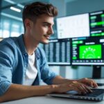 Sekelompok orang muda sedang menggunakan komputer dan perangkat digital untuk taruhan olahraga online di ruang kerja modern.