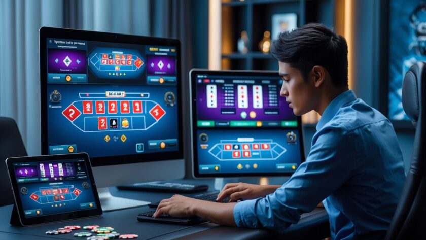 Seorang dewasa muda duduk di depan komputer dan tablet dengan beberapa meja baccarat digital di layar, di ruang kerja rumah yang terang dan rapi.