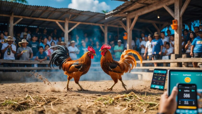 Arena sabung ayam di Filipina dengan ayam jago bertarung, penonton menonton, dan beberapa orang menggunakan perangkat digital seperti ponsel dan tablet.